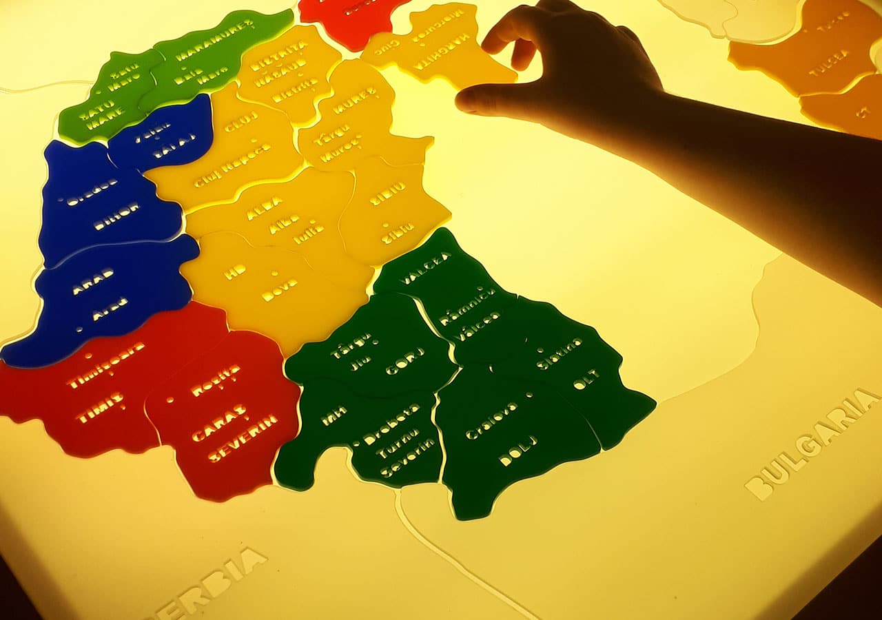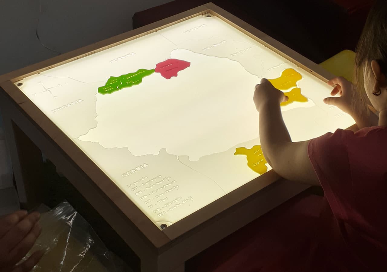 Primul produs special creat pentru masa noastră luminoasă, împreună cu Jucărie la cutie, este GATA! Harta României, cu regiuni istorice, județe, capitale de județ și vecinii României, este disponibilă pentru micii exploratori. Gândită ca un puzzle, harta devine foarte atractivă de explorat pentru copii datorită celor 9 culori folosite și a luminii propagate.